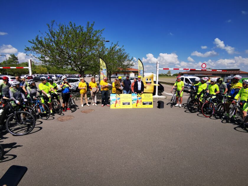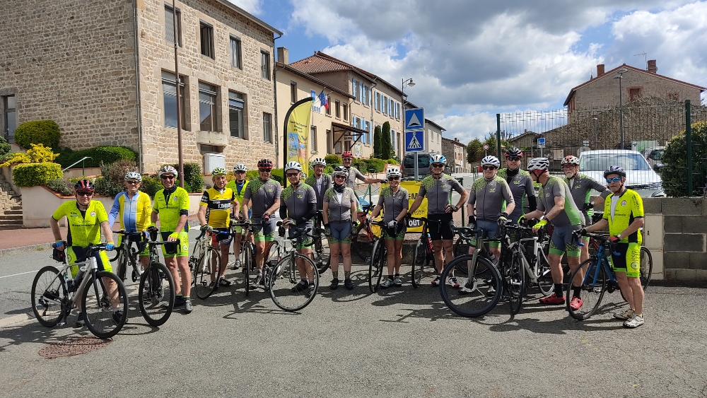 Aux Jacquins, futur site de départ de l’étape du jeudi 6 août 2026, les élus des communes de Loire Forez traversées par l’étape (Montbrison, St Thomas la Garde, St Georges Hauteville, St Romain le Puy, St Marcelin en Forez, Périgneux), les partenaires, bénévoles et associations se sont retrouvés pour célébrer ensemble cette échéance. Les associations de cyclistes étaient largement présentes pour l’événement (plus de 100 adeptes !) : le Comité départemental de cyclisme, le Vélo Club Montbrisonnais, les Cyclos Montbrisonnais et d’autres clubs cyclistes locaux qui se sont prêtés au jeu et ont fait le circuit qu’emprunteront les coureuses dans quelques mois. Ils ont ensuite été accueillis par la ville de Périgneux, commune traversée. Merci pour leur participation et bravo !