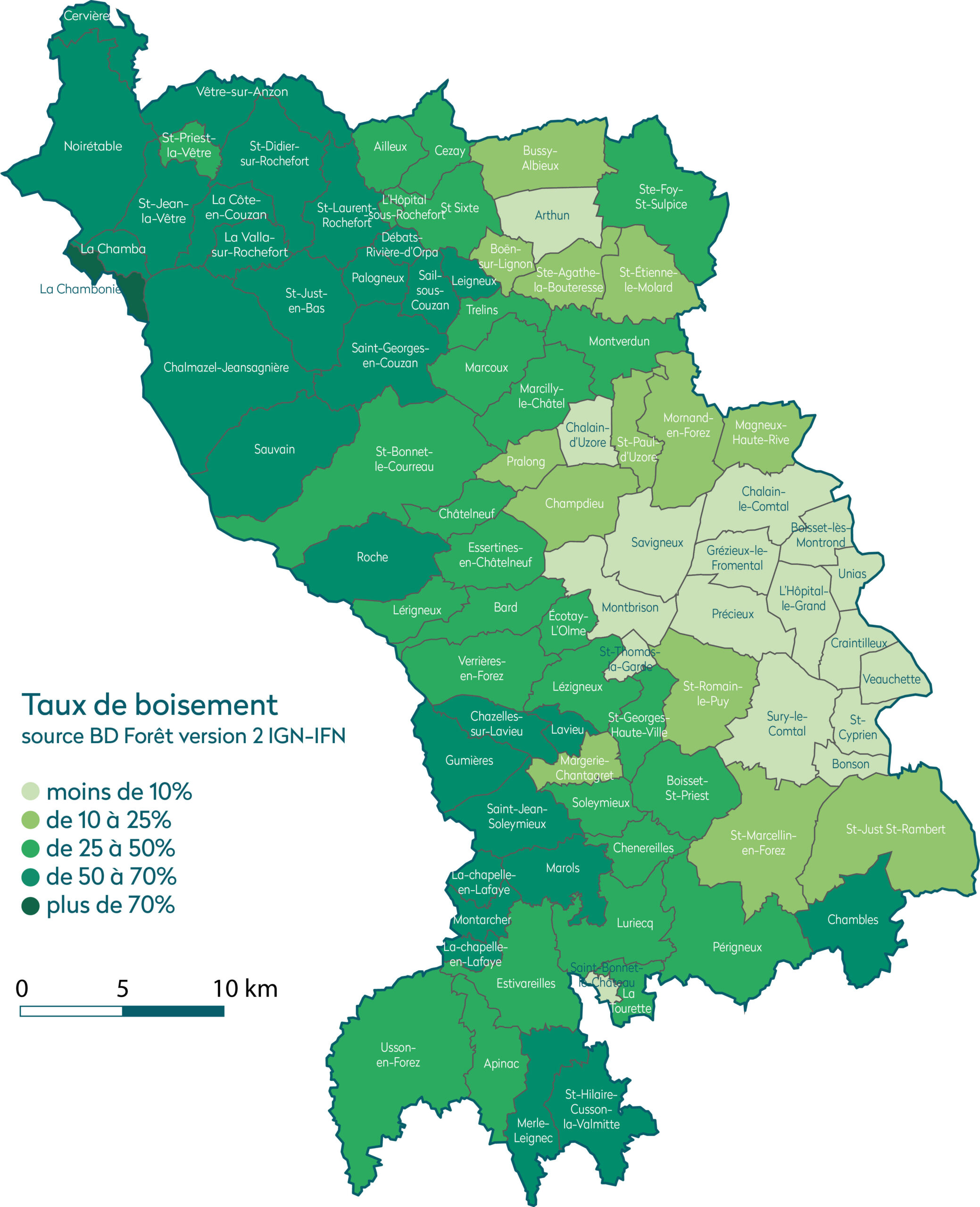 - Le territoire Loire Forez est boisé sur plus d’un tiers de sa surface : 48 688 hectares de forêts, soit 37% de sa surface totale.