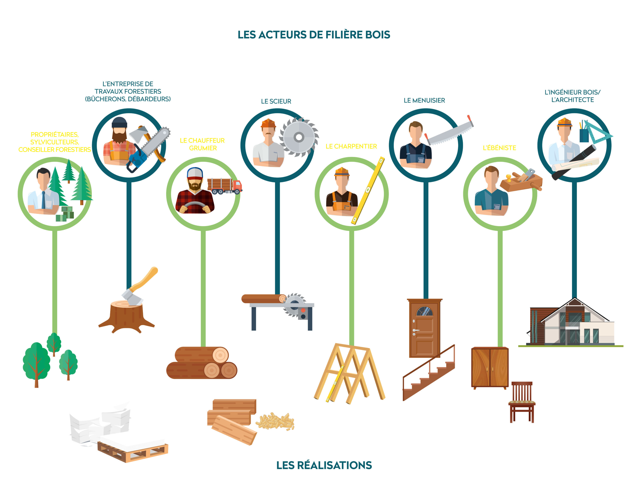 Métiers : sylviculteurs, entreprise de travaux forestiers (bûcherons, débardeurs), chauffeur grumier, scieur, charpentier, menuisier, ébéniste, ingénieur bois/architecte.