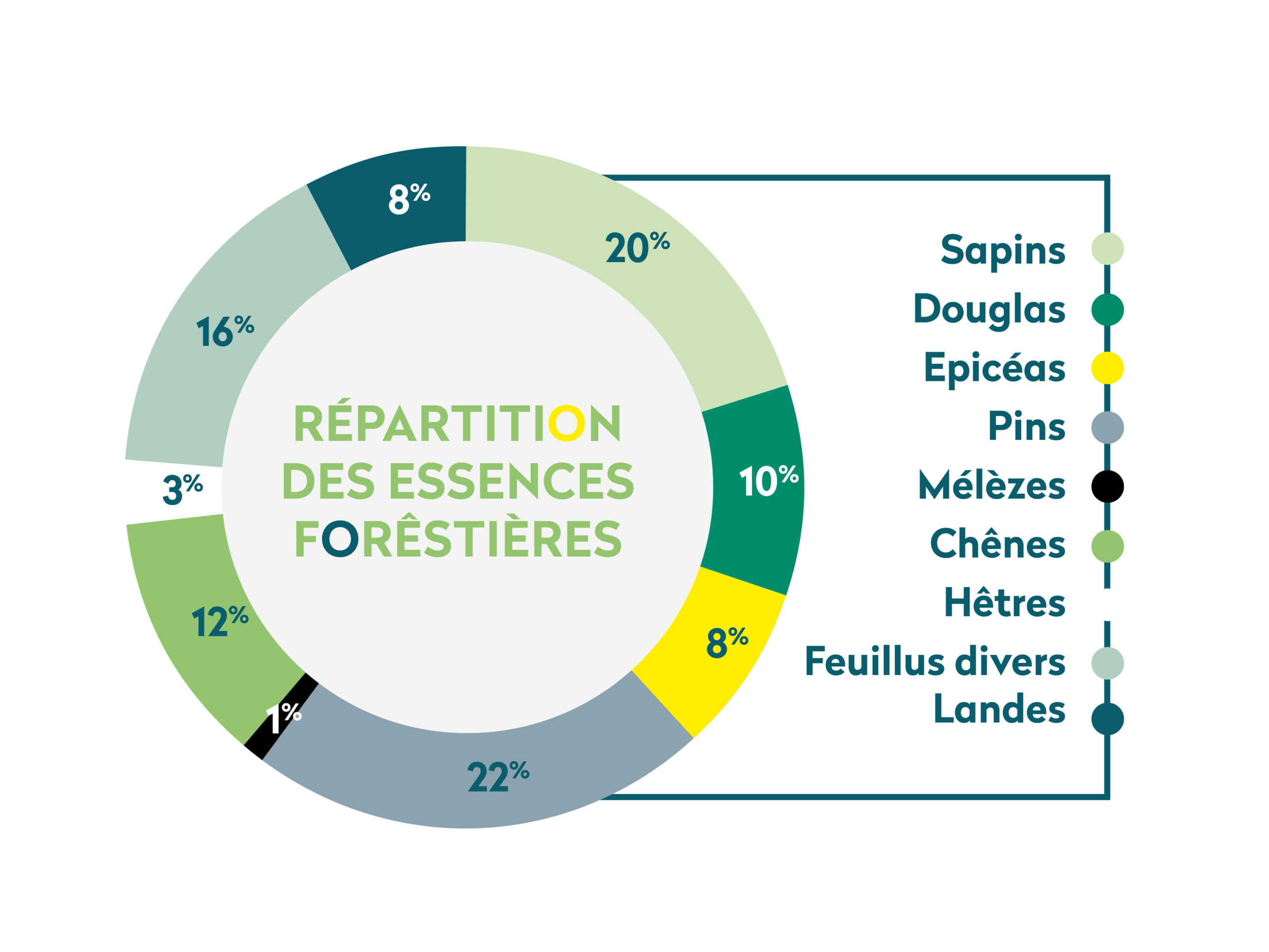 ¼ des peuplements sont dits « mixtes », c’est-à-dire qu’ils sont mélangés en essences : parcelles de chênes à dominante de pins (9 754 ha), hêtraie-sapinière (8 987 ha), futaies mixtes d’épicéa et de pin sylvestre (1 427 ha).
